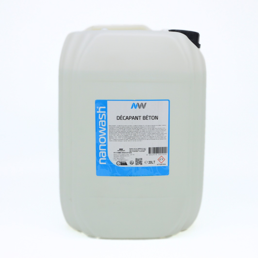 Le Décapant Béton (20L) est un produit puissant et concentré conçu pour éliminer les résidus de mortier de béton. Idéal pour nettoyer les surfaces encrassées, il est particulièrement efficace pour enlever les traces de béton, offrant ainsi une finition propre. Sa formule concentrée se dilue à 1/5 ou 1/10, selon la densité de la saleté, permettant de s'adapter à différents niveaux de nettoyage.